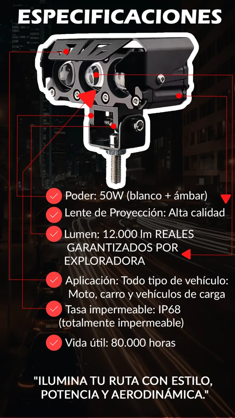 Estas exploradoras mejoran la iluminación de tu vehículo con 12.000 Lumenes de intensidad (REALES POR CADA EXPLORADORA). Compatible con todos los vehículos. Es impermeable, funciona a corriente  12V y 24V, y su carcasa de aluminio fundido asegura alta durabilidad. Con una vida útil de 80.000 horas, es ideal para mejorar la visibilidad y seguridad de tu vehículo.